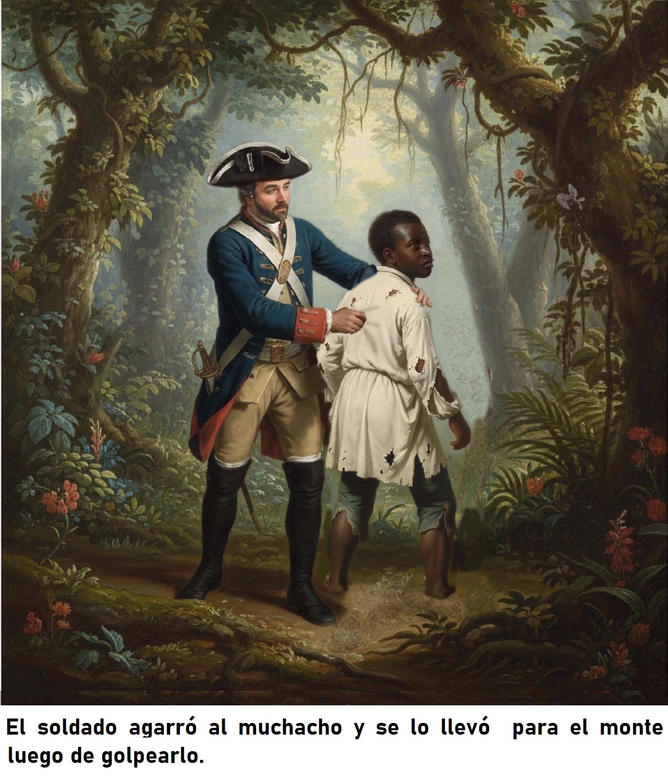 El “mulati­co” dice que vio como el sol­da­do lo tum­bó y se le echó enci­ma y  escuchó los gri­tos asfix­i­a­dos del otro mucha­cho como si tuviera la boca tapa­da y, entonces cor­rió has­ta la casa de Jua­na para avis­ar­les a los allí presentes.