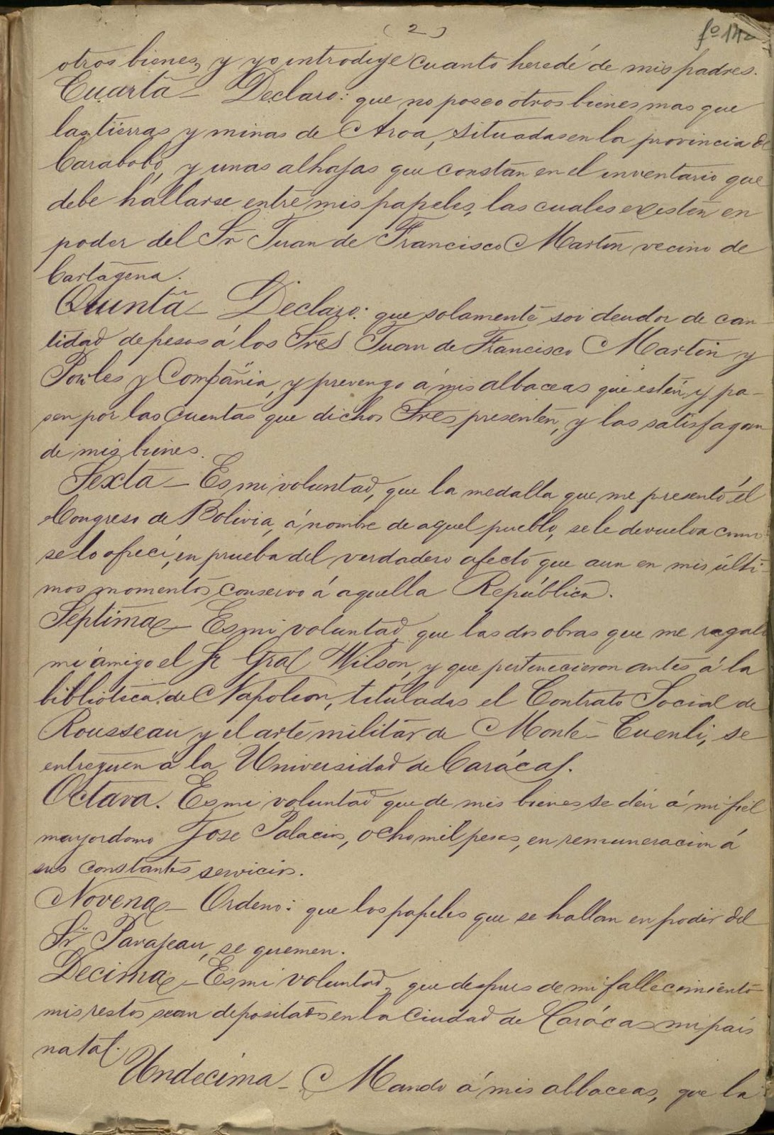 En el tes­ta­men­to de Bolí­var dis­pu­so entre sus últi­mas voluntades: