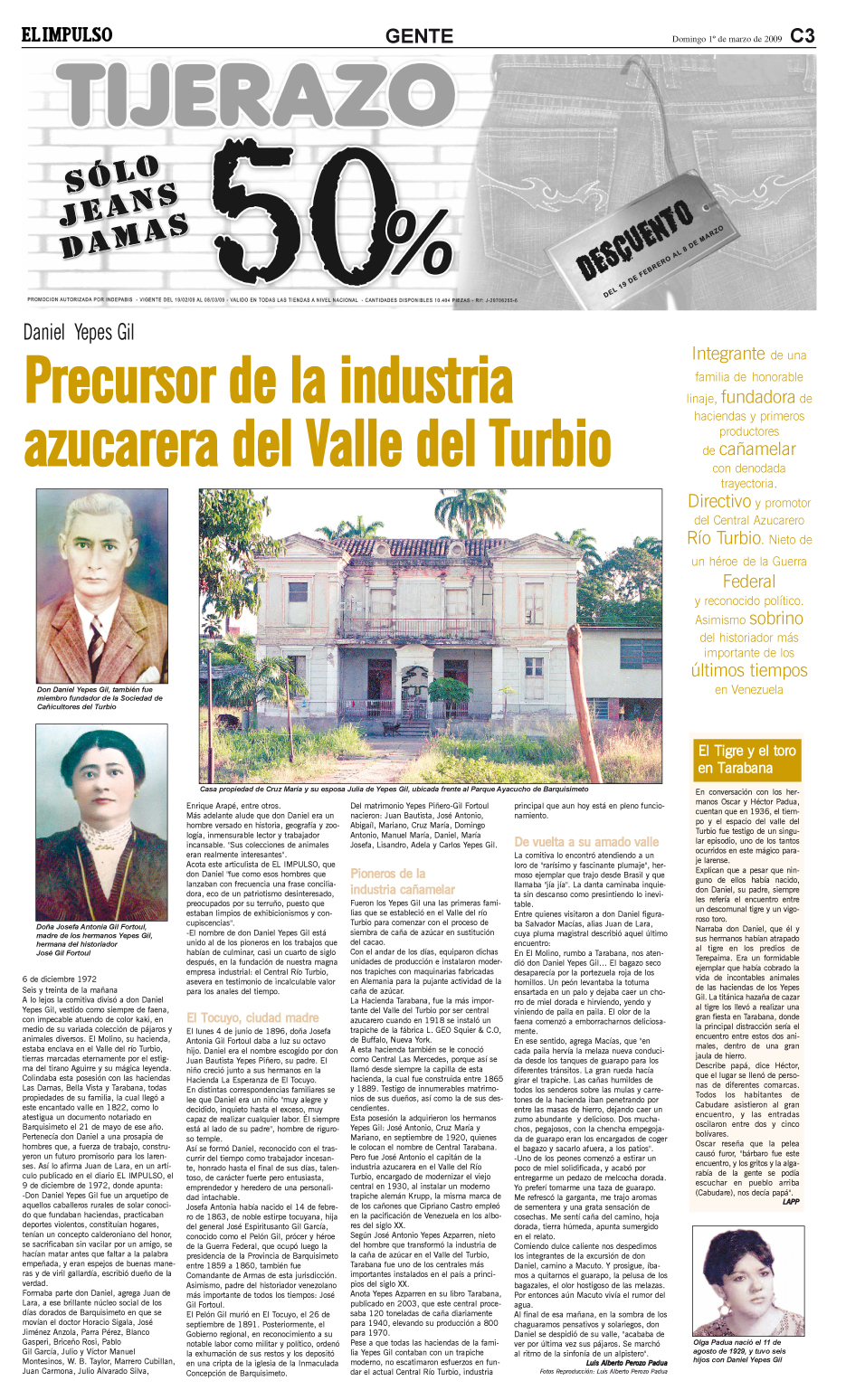El nombre de don Daniel Yepes Gil está unido al de los pioneros en los trabajos que habían de culminar, casi un cuarto de siglo después, en la fundación de nuestra magna empresa industrial: el Central Río Turbio, asevera en testimonio de incalculable valor para los anales del tiempo.