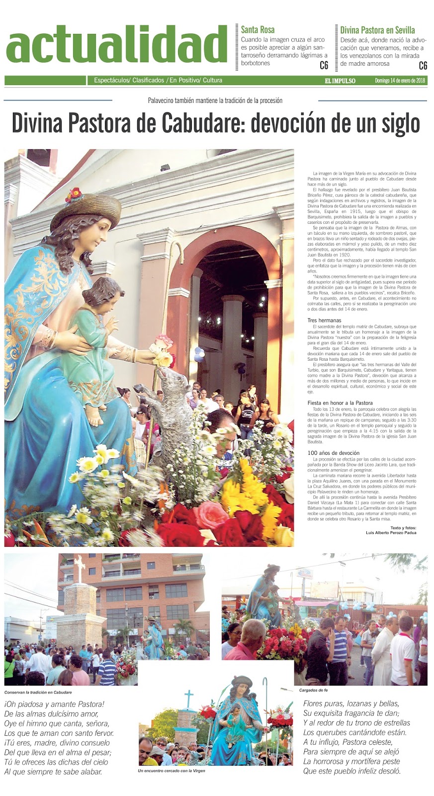 El sacerdote del templo matriz de Cabudare, subraya que anualmente se le tributa un homenaje a la imagen de la Divina Pastora “nuestra” con la preparación de la feligresía para el gran día del 14 de enero. Recuerda que Cabudare está íntimamente unido a la devoción mariana que cada 14 de enero sale del pueblo de Santa Rosa hasta Barquisimeto.