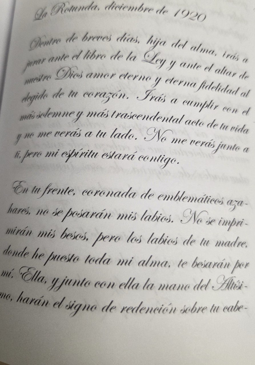 “A ti y a tu Daniel os estrecho entre mis brazos con toda la ternura de mi corazón, que es todo amor para vosotros. Dile que te haga feliz, tan feliz como bien lo mereces y colmará los anhelos de quien, por no hallarse entre vosotros, se siente el más desventurado de los padres, pero que será el más dichoso si os hacéis dignos de que desciendan sobre vuestro hogar las bendiciones del Cielo, que imploro de rodillas.