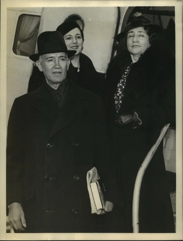 Washington, D.C. — el Dr. Esteban Gil-Borges, acompañado por la señora (Matilde Amelia Martínez Paz Castillo) Gil-Borges (derecha) y su hija, la señorita María Gil-Borges, fueron fotografiados mientras abordaban un avión con destino a Miami, donde conectarán con otro vuelo que los llevará a Caracas y al nuevo cargo del doctor como ministro de Relaciones Exteriores de Venezuela. Desde 1924, el Dr. Gil-Borges ha sido director asistente de la Unión Panamericana. Ha sido una figura importante en el gobierno (Traducido del inglés)