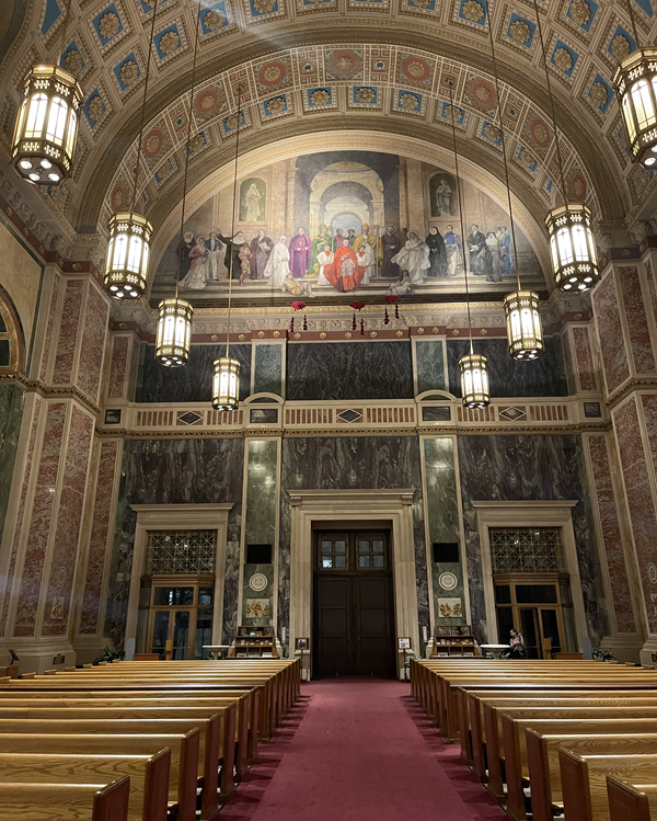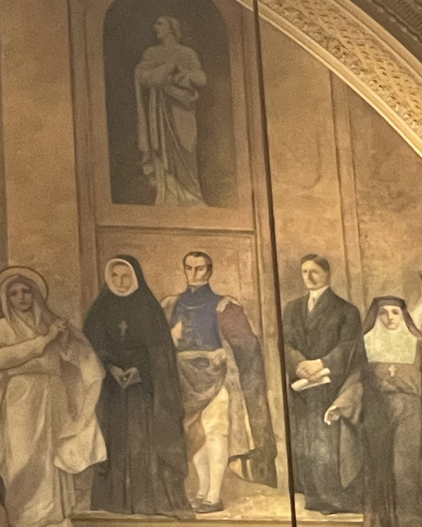 La figura del Libertador Simón Bolívar se observa a la derecha La presencia del Libertador en un mural de carácter eclesiástico no responde a un culto religioso, sino a su condición de referente histórico y moral de sociedades profundamente marcadas por la tradición católica. Su imagen sintetiza el vínculo entre fe, cultura y procesos de emancipación en América Latina. La catedral, de estilo neorrománico, fue diseñada por el estudio Heins & LaFarge e inaugurada en 1913.