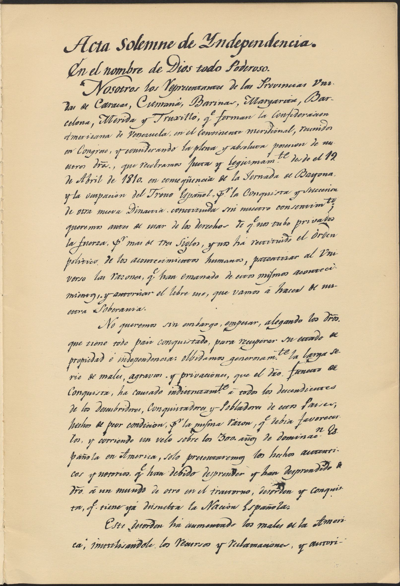 “Nosotros, los Representantes de las Provincias Unidas de Caracas, Cumaná, Barinas, Margarita, Mérida y Trujillo, que forman la Confederación Americana de Venezuela en el Continente Meridional, reunidos en Congreso, y considerando la plena y absoluta posesión de nuestros derechos, que recobramos justa y legítimamente el 19 de Abril de 1810…”.