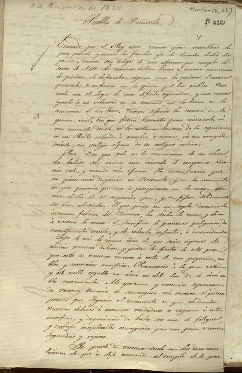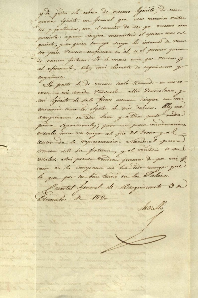Pablo Moril­lo noti­f­i­can­do al Rey su der­ro­ta en la Batal­la de las Que­seras del Medio en Apure, el 02 de abril de 1819.