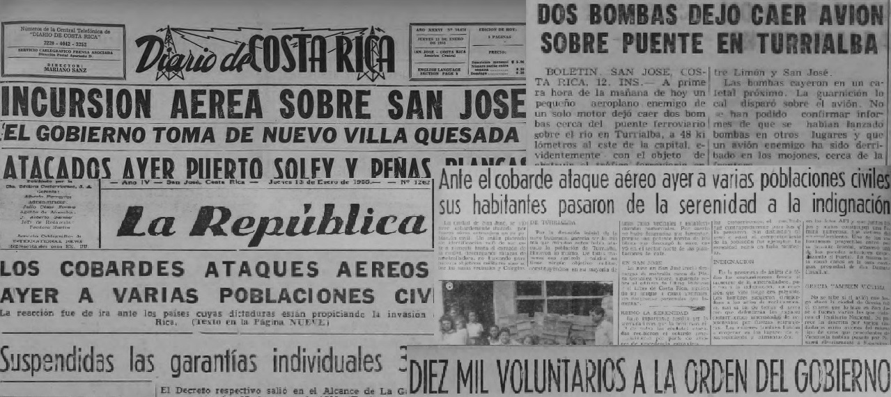 El gobierno de Figueres Ferrer denunció que aviones militares venezolanos enviados por Pérez Jiménez despegaban desde Nicaragua llevando refuerzos humanos, armamentistas y de víveres a los sublevados invasores en territorio costarricense. Peor aún denunciaron que aviones de combate venezolanos atacaron con fuego de metralla varias ciudades de Costa Rica; la propia capital del país, la ciudad de San José fue atacada por un avión venezolano, que habría dejado caer algunas bombas.